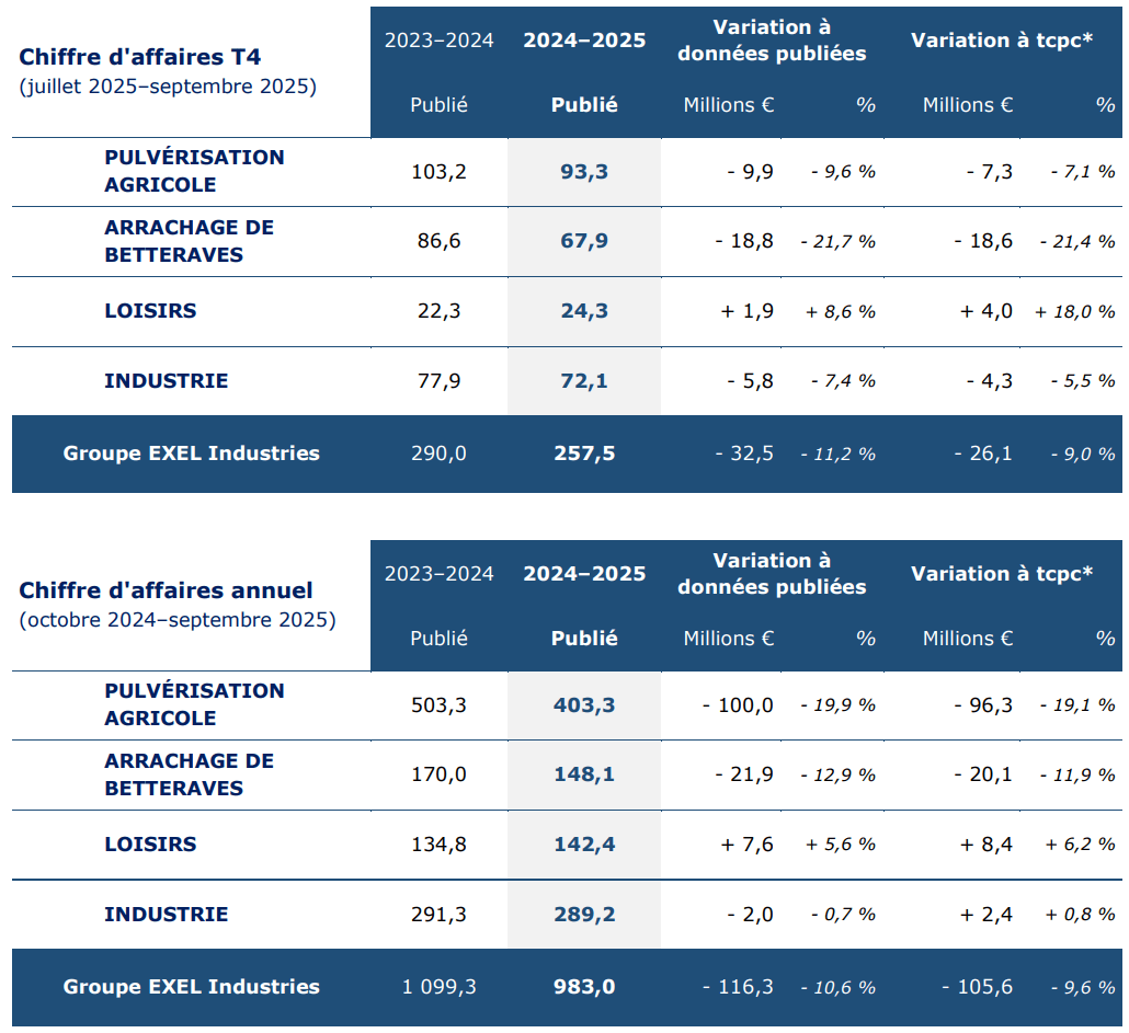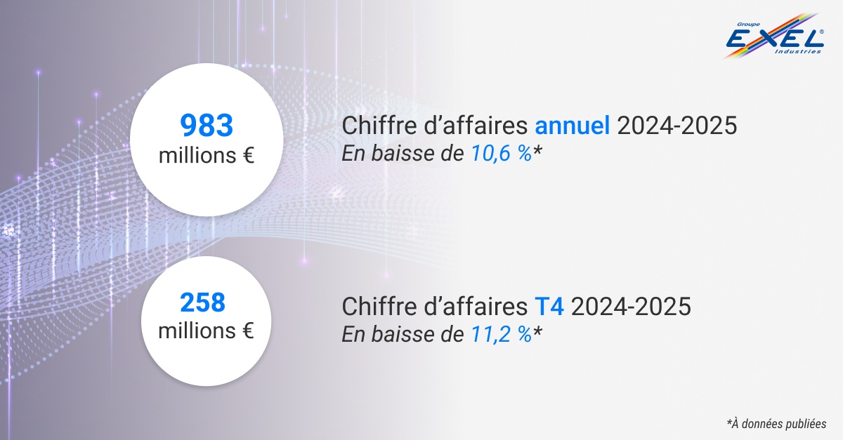En 2024–2025, le chiffre d’affaires d’EXEL Industries atteint 983 millions d’euros, en recul de 10,6 %, soit une baisse de 9,6 % à périmètre et taux de change constants.