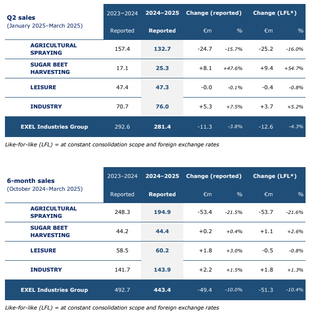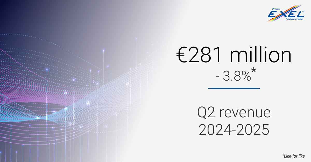 The EXEL Industries Group generated revenue of €281.4 million in the second quarter of the 2024-2025 fiscal year, down -3.8% on the previous year, mainly due to lower volumes in Agricultural Spraying, with other activities either stable or growing. At constant scope and foreign exchange rates, revenue was down -4.3%.