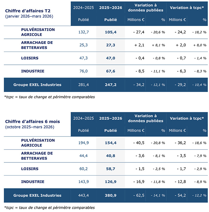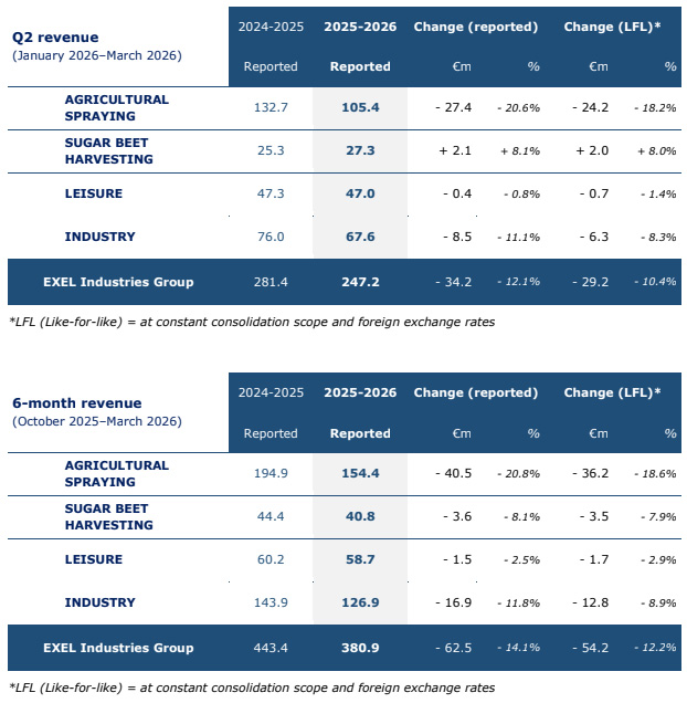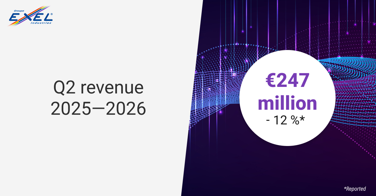 The EXEL Industries Group generated a €247.2 million revenue in the second quarter of the 2025-2026 fiscal year, a drop of 12.1% compared to the previous year, mainly due to lower volumes in Agricultural Spraying and Industry. At constant scope and foreign exchange rates, revenue dropped by 10.4%.